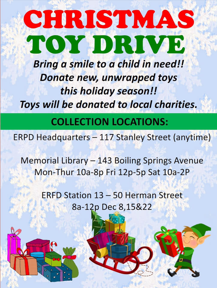 - The East Rutherford PBA and East Rutherford FD and collecting toys for annual Christmas Toy Drive. Please stop at one of our donation locations and drop off an unwrapped present to help children in need.